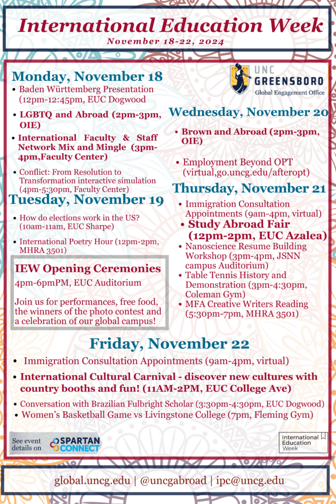 UNCG’s International Education Week runs November 18-22, 2024. Check out all of the fun ways to celebrate with us below!